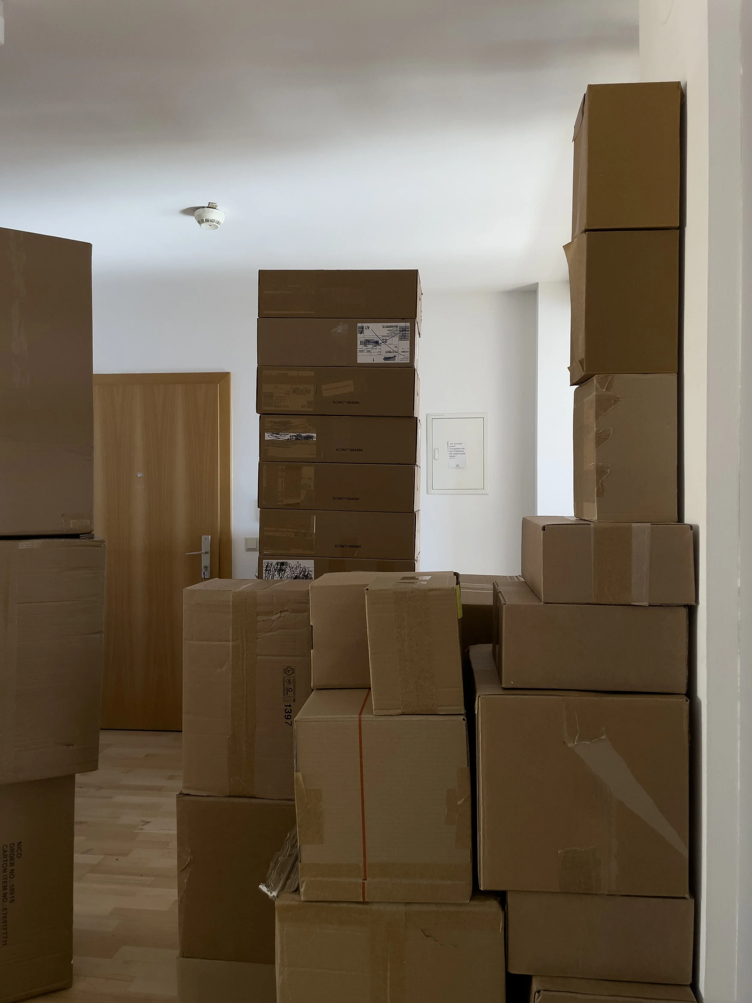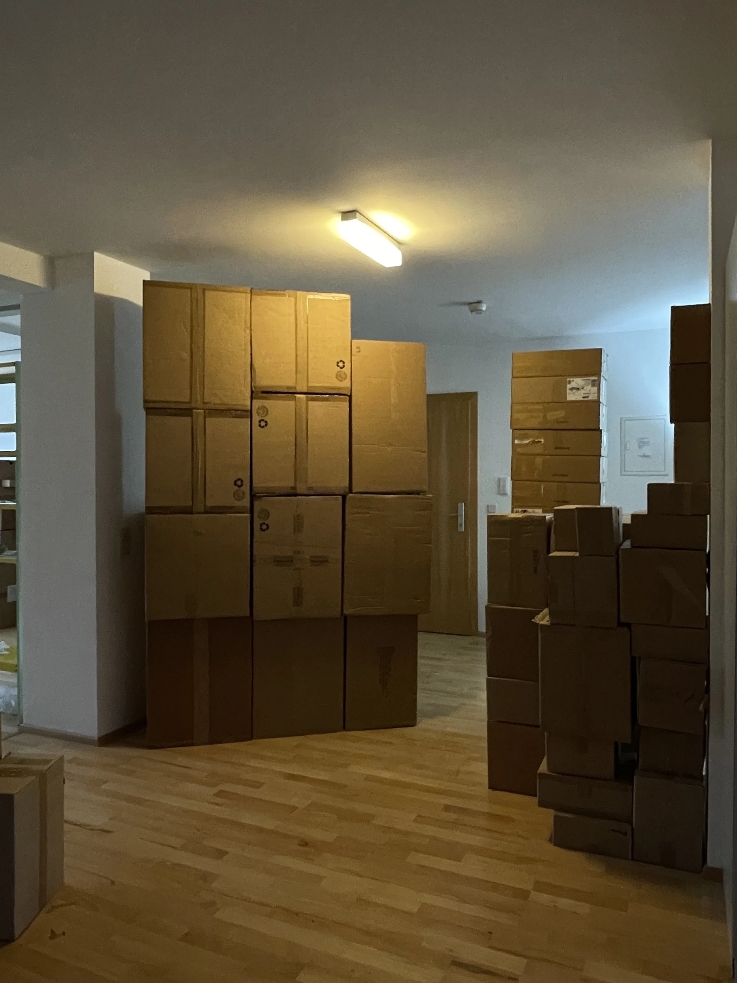 It comprises the remaking and adjustment of the architecture and spatial pathways of the existing living spaces as a type of ‘temporary architecture’, through building forms, partitions, floor areas, columns and clusters with found and collected cardboard packing boxes (kartons in German).